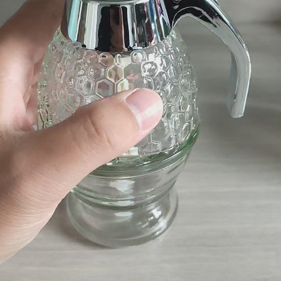 Descripción: Este dispensador de miel de vidrio, con diseño de panal, permite un vertido preciso gracias a su mecanismo antigoteo. Su base de soporte evita derrames y facilita el almacenamiento. Ideal para miel, jarabes y otros líquidos espesos.