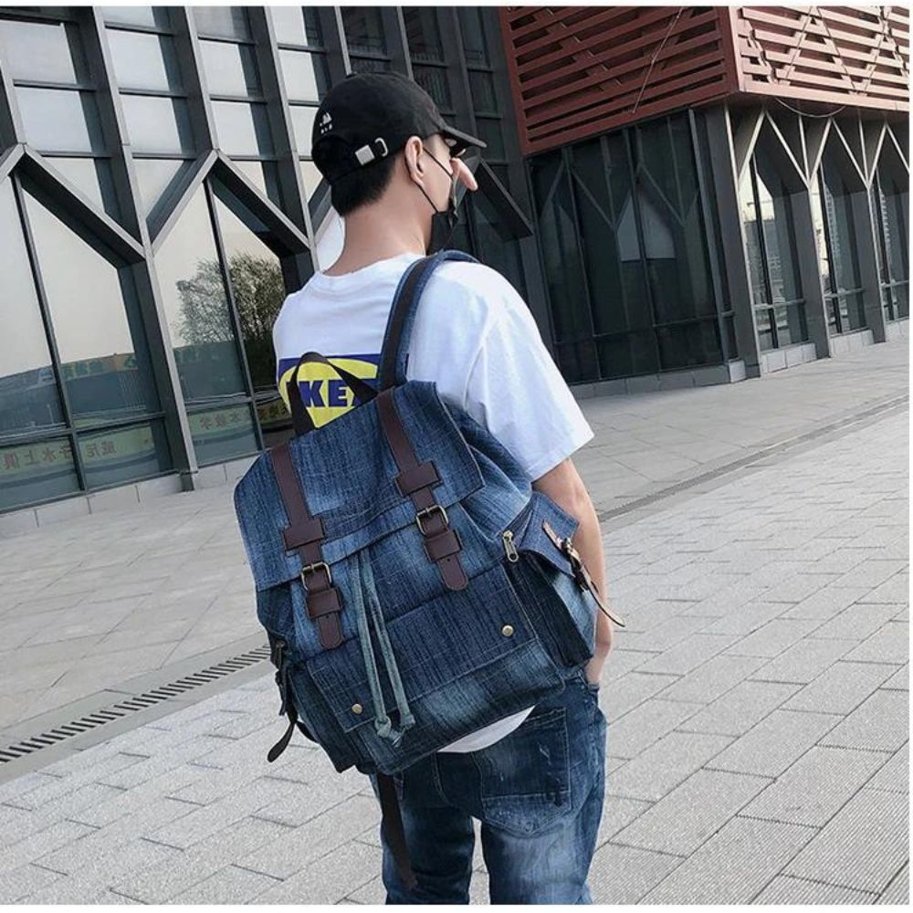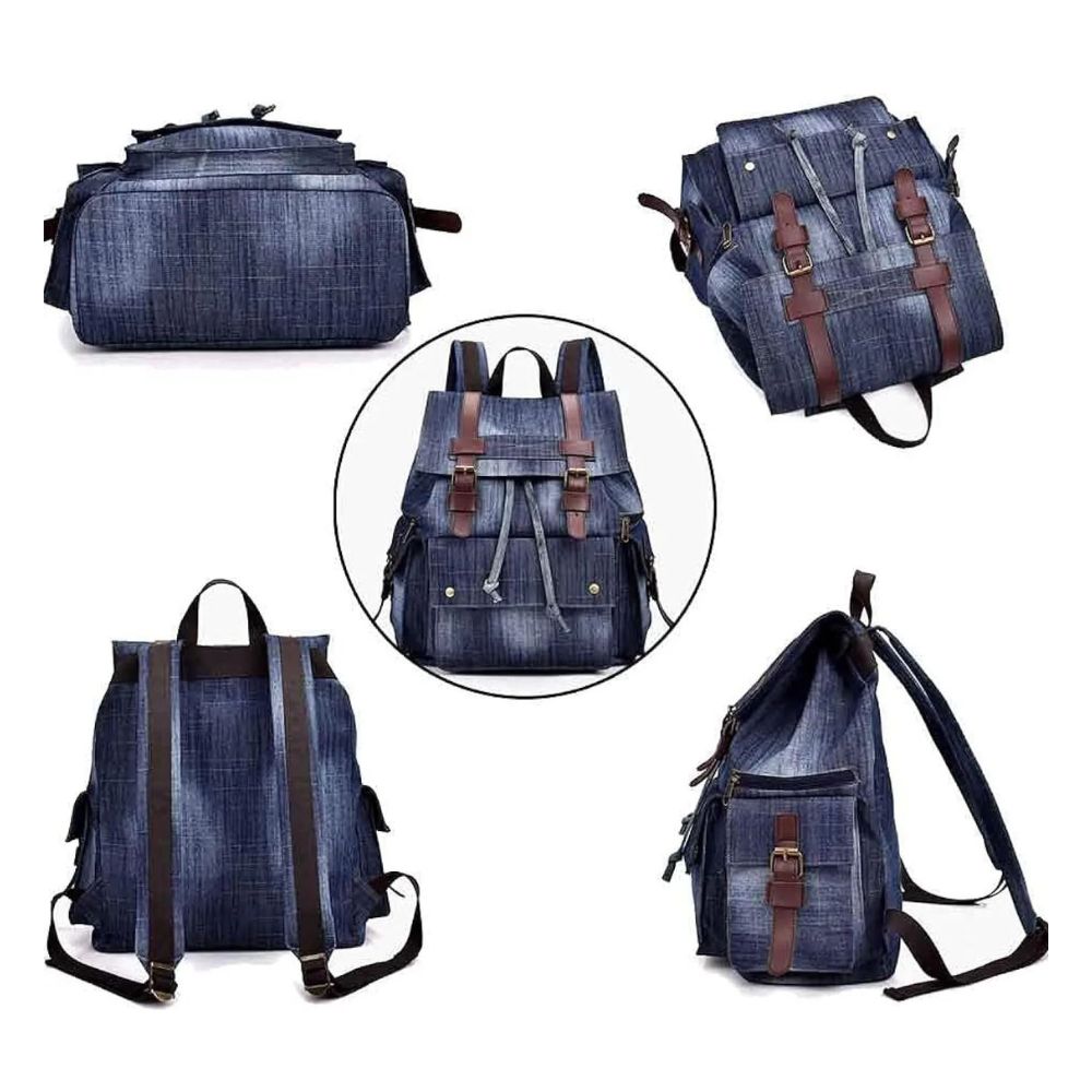 Material: Denim Detalles: Cuero PU Forro: Poliéster Medidas Aprox: 35*16*45 cm Abertura: Broches imantados y hebillas Diseño multi bolsillo para poder organizar mejor tus artículos:*4 bolsillos externos laterales, 2 bolsillos con cierre*1 bolsillo frontal + broche imantado*3 bolsillo interno, 1 con cierre