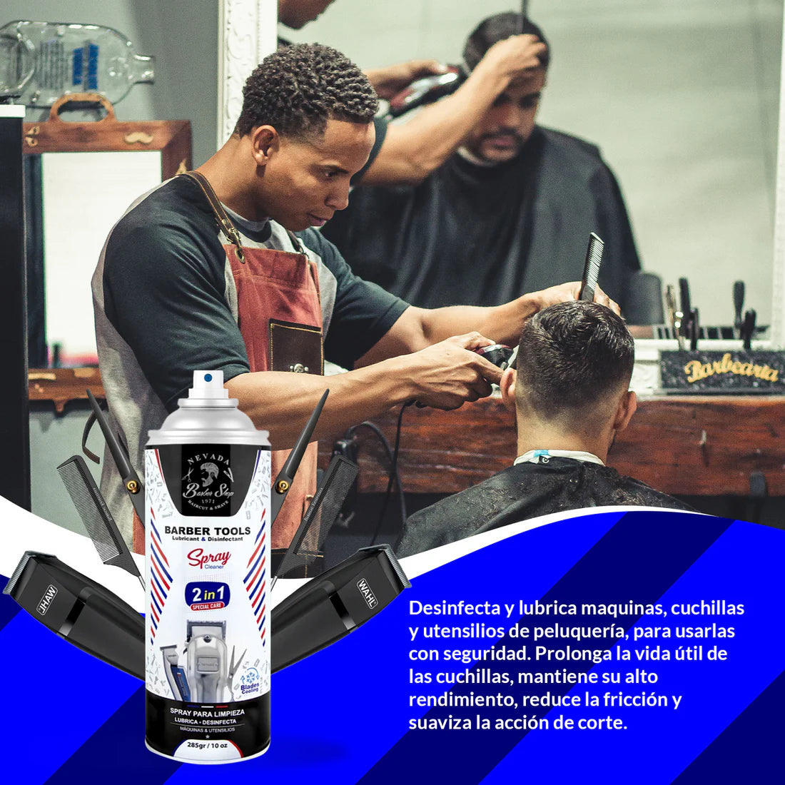 Barber Tools Lubricante & Desinfectante en Spray 2 en 1 - Nevada Barber Shop Spray para limpieza lubrica y desinfecta – Barber Tools Desinfecta y lubrica maquinas, cuchillas y utensilios de peluquería, para usarlas con seguridad. Prolonga la vida útil de las cuchillas, mantiene su alto rendimiento, reduce la fricción y suaviza la acción de corte. Características: Alto Rendimiento. Modo de uso: Retirar cualquier residuo con la ayuda de un pañito antes de aplicar el producto. Rocié a unos 10 centímetros de distancia y espere a que seque. Advertencia: Para uso externo solamente. Mantener fuera del alcance de los niños. Nunca rociar el producto cerca del fuego o en artículos electrónicos encendidos, fusibles o sustancias inflamables. No exponerlo a la luz solar o a temperaturas mayores a 50 °C. El envase está presurizado, no agujerar el envase vacío o no tirar al fuego. Marca: Barber Tools. Origen: Panamá. Fabricante: Nevada Natural Productos .Beneficio: 2 en 1, previene el óxido. Uso: Maquina y utensilios de contar. Cantidad: 285gr.Se emite boleta o factura.